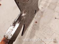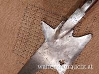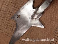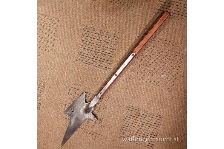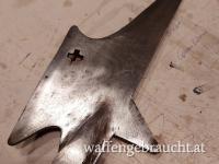 "Helebarde" schwere Halbarte um 1670 Schweiz, Museumsreplikat, Eisen geschmiedet ( kein Stanzblech ) Stange verkürzt, Gesamtlänge 95cm, Halbarte Eisen Länge ca. 70cm mit Schaftfedern, ehem. Standschützentrophäe 1954, ein interessantes Dekostück, Versandkosten in A 20,00