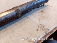 antikes Luntenschloss-Gewehr aus Verlassenschaft, Zustand dem Alter entsprechend siehe Fotos, Schaft überarbeitet (ebonisiert), langer schwerer dickwandiger Lauf vorne trichterförmig geweitet, gemarkt siehe Fotos, Länge 150cm, Versand in A 25,--