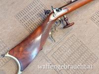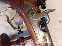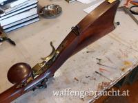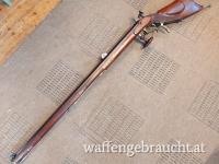 Sammlungsauflösung - Auftragsverkauf - Stand-Stutzer Perkussion um 1840, cal. 11mm, schwerer 8-Kantlauf, mit deutschem Stecher und gravierter Schlossplatte, hervorragend gepflegter Zustand, schöner Nußbaumschaft, vorderer Schaftabschluss aus Horn, Messinggarnituren, Handauflage, Diopter, Schlossfunktionen OK, alles original inkl. Putzstock, Gewicht ca. 7-8kg, ein Museumsstück, Versandkosten in A 25,00