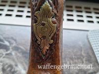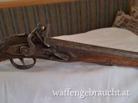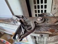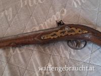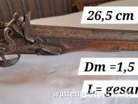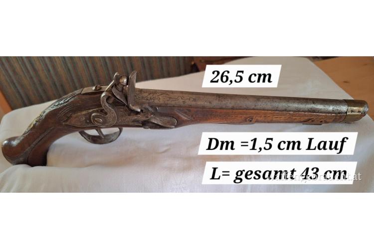 Steinschlosspistole dürfte von 1800 oder Anfang 1900 sein nach dem Holz zu Urteilen ist sie nicht mehr die Jüngste ,ober dem Knauf und Seitlich befindet sich eine Messing Blech Einlage .Etwas Reparierungs Bedürftig beim Spanner und Abzug Feder defekt .