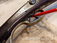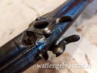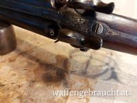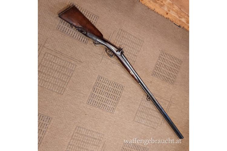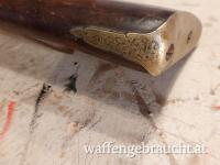 Sammlungsauflösung - Perkussion-Hahnenflinte, gepflegter Allgemeinzustand, geschnitzter Schaft mit Backe, gravierte Messinggarnituren ebenso die Schlossbleche, Schlossfunktionen OK, Putzstock fehlt, Versandkosten in A 18,00
