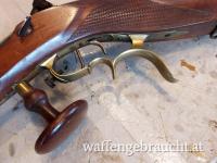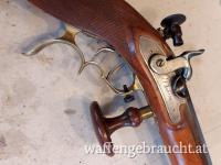 Sammlungsauflösung - Stand-Stutzer, Perkussion, sehr gepflegter Zustand 1-2, mit deutschem Stecher, schwerem 8-Kantlauf, cal. 11mm, Dioptervisierung, Gravur an Schlossplatte Handauflage, Messinggarnituren, Gewicht ca. 8kg, Gesamtlänge 128 cm, alles original inkl. Putzstock, Versandkosten in A 25,00