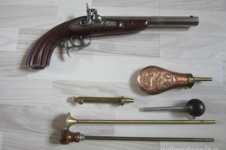 Diese edle Perkussionspistole vereint historische Eleganz mit moderner Präzision. Inspiriert von französischen Duellpistolen des frühen 19. Jahrhunderts, besticht sie durch hochwertige Materialien und eine sorgfältige Verarbeitung.