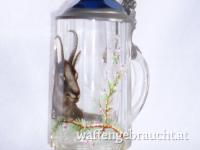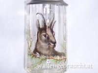 Glaskrug mit Deckel aus Zinn und Glas, Gamsmotiv, 18 cm