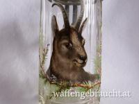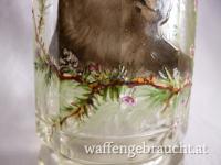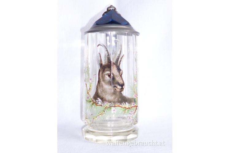 Glaskrug mit Deckel aus Zinn und Glas, Gamsmotiv, 18 cm