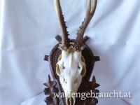 Nr. 6: Rehtrophäe, Rehgeweih, Geweihhöhe 21 cm, auf handgeschnitztem Schild aus Massivholz, VB 49,--