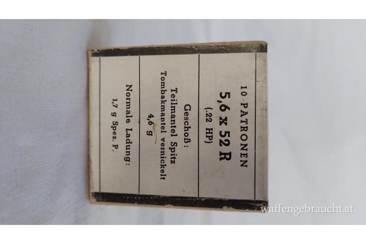 Verkaufe eine Packung Munition 5,6x52R (.22 HP) Teilmantel Spitz Geschoße des Herstellers IWK (Industriewerke Karlsruhe) mit 10 Patronen. Preis pro Packung 40€.