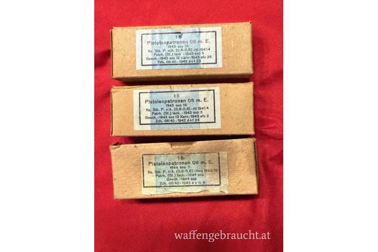 Verkaufe 3 Packungen Pistolenpatronen 08 m.E. (mit Eisenkern je 16 Stk) aus dem 2. Weltkrieg in einem Top Zustand. Siehe Bilder, 1943 und 1944
