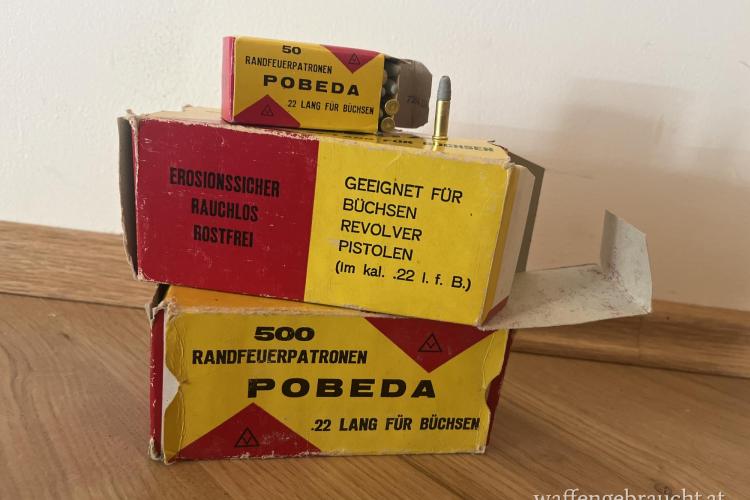 Verkaufe aus Verlassenschaft eine alte aber funktionierende Kleinkaliberpatronen der Firma Pobeda.