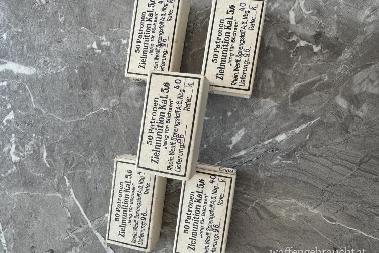 RARITÄT – 5x ungeöffnete Originalpackungen Zielmunition Kal. 5,6 lang für Büchsen – RWS / Rheinisch-Westfälische Sprengstoff A.-G.