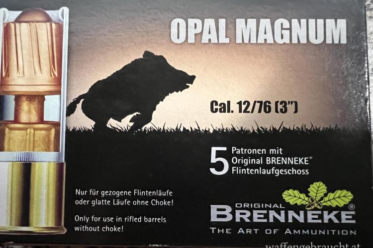 Es gibt wohl weltweit keine Flintenpatrone, die es mit der neuen OpalMagnum im Kaliber 12/76 aufnehmen könnte. Bestückt mit einem 43,0 g (666 grs/1 ½ oz) schweren Projektil weist sie außerordentlich beeindruckende Energiewerte auf. Bei einer V0 von 491 m/s sind das 5.184 Joule. Selbst auf eine Entfernung von 100 m erreicht die OpalMagnum noch 2.173 Joule. Mit Streukreisen von unter 10 cm bei 5 Schuss auf 100 m ist die Präzision weit überdurchschnittlich. Die breiten und nach links gerichteten Rippen dienen der optimalen Übertragung des Dralls. Dadurch eignet sich diese Spezialpatrone in erster Linie zum Verschießen aus gezogenen Flintenläufen. Sie kann aber problemlos auch aus Flinten mit Zylinderläufen verschossen werden. Aus Läufen mit jeder Art von Choke darf sie wegen ihrer Rippenform nicht verwendet werden. Die Beschichtung des Geschosskopfes dient der Verminderung des Bleiabriebs im Lauf. Die OpalMagnum eignet sich aufgrund ihrer hohen Auftreffenergie jagdlich in erster Linie für Drückjagden und die Jagd auf schweres Schalenwild sowie auf wehrhaftes Großwild wie Büffel oder Löwen.