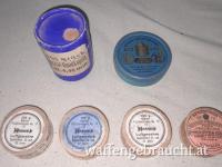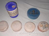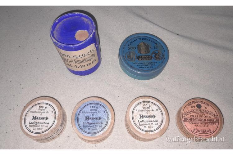 6 antike Dosen mit Munition für Luftgewehre, Zustand siehe Bilder. Die 4 kleinen Kartondosen sind noch original verschlossen, die beiden großen Dosen wurden bereits geöffnet, sind jedoch noch fast voll.