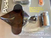Zum Lieferumfang gehören eine Universal-Pulverpfanne mit integriertem Trichter, ein Pulverlöffel und ein Kalibriergewicht.