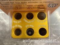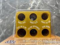 Mit der Patronenlehre "Ammo Checker Large Rifle" von Lyman lassen sich Patronen verschiedener Kaliber mit nur einem Handgriff auf richtige Maßhaltigkeit für das Patronenlager prüfen. Eine Patronenlehre für die Wiederladewerkstatt kaufen und gleich 6 mögliche Kaliber wiederladen und prüfen.