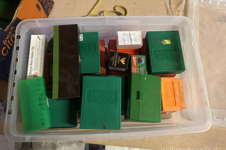 Zum Verkauf steht ein umfangreiches Konvolut an Wiederlade-Produkten für Patronen, ideal zur Ergänzung einer bestehenden Ausrüstung oder für erfahrene Wiederlader.
