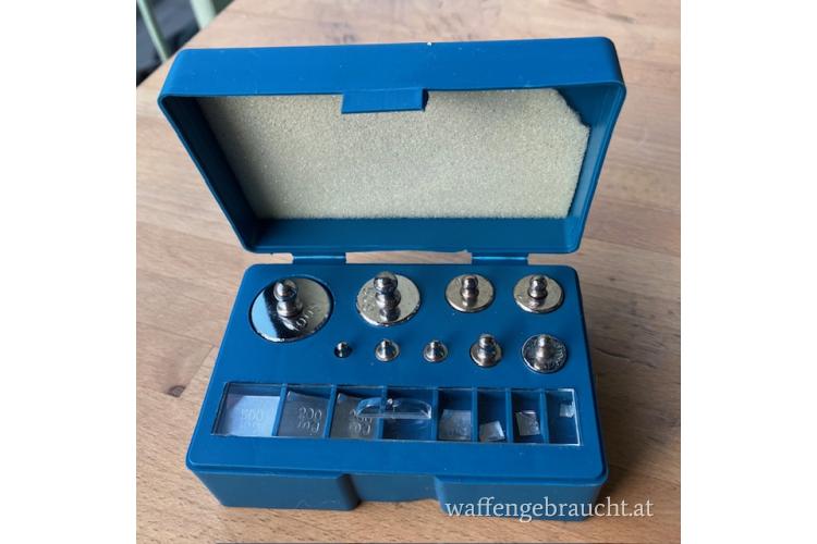 Set mit Kalibriergewichten um 15 Euro zu verkaufen. Ein Plättchen fehlt, wahrscheinlich 50 oder 100 mg.