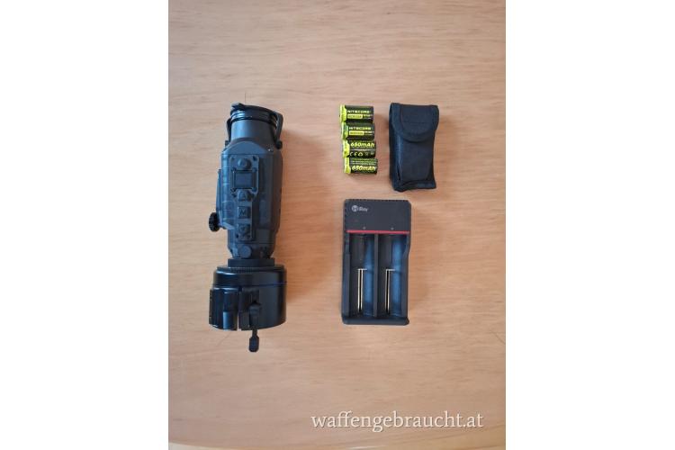 Ich biete ein Wärmebildvorsatzgerät der Marke "Guide", Modell TA 435, zum Verkauf an. Es handelt sich um ein günstiges Einsteigermodell, das durch zwei Akkus (4 davon sind im Lieferumfang enthalten) betrieben wird und sich ideal für die Jagd an der Kirrung eignet. Das Gerät ist in einem allgemein guten Zustand und voll funktionstüchtig, es weist jedoch leichte Gebrauchsspuren auf.