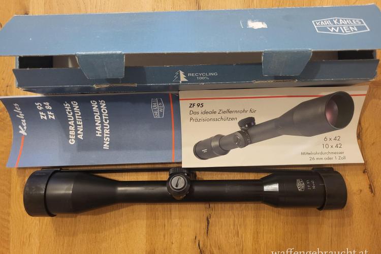 Verkaufe Kahles Zf95 10x42 in der Originalverpackung und original Beschreibung (siehe Bilder). Einmalige Gelegenheit, so eigentlich kaum mehr zu bekommen. Absehen 104. Alles funktioniert natürlich, Durchsicht ist klar, Linsen kratzerfrei. Minimale Montagespuren von der Montage.