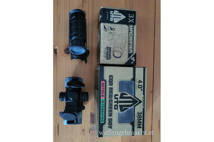 Bitte hier ein Rot/Grünpunkt von UTG an, inkl. Flip Vergrößerung 3 Fach. Die Schnellmontage ist bei beiden vorhanden.