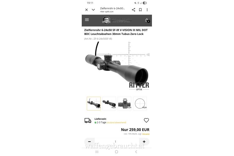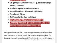Verkaufe neuwertiges Zielfernrohr der Marke Ritter 6-24x50 SF-IR V-VISION III MIL DOT BDC Leuchtabsehen 30mm Tubus im Original-Karton...bis auf die Montagespuren eigentlich neu...leider zu lange für mein Knicklaufgewehr..Beschreibung siehe Bilder. Ohne Montage wie auf den ersten Bildern..mit Sonnenblende, Sidewheel, Batterie, Staubschutzkappen (nicht dieser auf den Bildern) sowie der Okulargummi den man auf den letzten Bildern sieht (natürlich zum abnehmen oder draufstecken) Preis ist fix. NEUPREIS 259,-