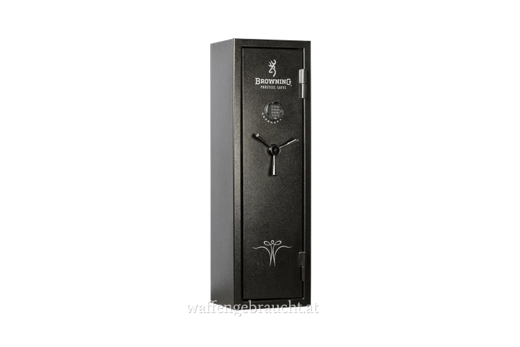 Ein Einstiegsmodell zur Aufbewahrung von 10 Waffen mit Feuerschutz, Sicherheit und reduziertem Raumbedarf in einem einzigen Tresor. THERMABLOCK: Feuerschutz für 30 Minuten. 3,5-MM-STAHLTÜR: Dicke und verstärkte Tür für erhöhte Sicherheit und Schutz gegen Einbruch. 3-MM-STAHLGEHÄUSE: Stahldicke: 3 mm. 9 BOLZEN: 9 Verriegelungen in der Tür. FESTE UND VERSCHIEBBARE VERRIEGELUNGEN: Aktive Verriegelungen auf drei Seiten der Tür: oben, unten und rechts, 2,54 cm dick. Feste Verriegelungen auf der linken Seite der Tür. UL-NORM: Amerikanische Norm zum Einbruchschutz. VDMA-NORM: Die Browning-Tresore entsprechen der Norm VDMA 24 992 Stufe A. 180°-TÜRÖFFNUNG: Die Tür kann komplett, das heißt, zu 180° geöffnet werden. VERSTÄRKTE TÜR: Stählerner Türrahmen zur verbesserten Einbruchsicherheit ELEKTRONISCHES SCHLOSS: Schloss mit elektronischer Kombination. 3-SPEICHEN-GRIFF: Tresor mit Griff mit drei Speiche. FORCE DEFLECTOR: Ein exklusives System zur Verhinderung der Energieübertragung auf den Griff. Wird eine zu hohe Kraft auf den Griff ausgeübt, so dreht er leer.