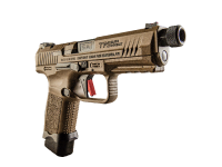 Die TP9 Elite Combat ist eine vielseitige Kompaktpistole mit Leistungsteilen, die in Zusammenarbeit mit Salient Arms International entwickelt wurden, darunter ein geriffelter und nitrierter Match-Grade-Lauf, ein Gewindeschutz, ein Visierset und ein Magazinschacht. Die kompakte Pistole hat einen Polymerrahmen, wird mit Schlagbolzen abgefeuert und verfügt über einen optikbereiten Schlitten mit vier verschiedenen Schnittstellen, um die beliebtesten Reflexvisiere des Marktes aufzunehmen. Schiebestopphebel auf beiden Seiten ermöglichen eine beidhändige Verwendung. Verlängerungen für den Magazinauslöser und alternative Rückengurte sind enthalten, um eine ideale Passform zu ermöglichen. Die Pistole enthält ein 15-Schuss-Magazin und ein 18-Schuss-Magazin mit einer +3-Aluminiumverlängerung. Die Pistole ist in 9 x 19 mm erhältlich und hat eine Cerakote-over-Tenifer-Oberfläche auf dem Schlitten für langanhaltende Korrosionsbeständigkeit. Die internen Komponenten der Zündsteuerung sind für reibungslosen Betrieb und hohe Leistung vernickelt. Ein patentiertes Holster, ein Magazinlader und ein Reinigungsset werden standardmäßig mit der Pistole geliefert.