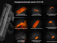 Die CZ P-10 ist ein weiterer „Level“ einer Schutz- und Dienstpistole, die durch hohe Zuverlässigkeit, Standzeit und kultivierte Schussbeherrschung besticht. Anteil daran haben hervorragendes Checkering und ausgezeichneter Griff, der in neuer ergonomischer Methodik DiFEND gelöst ist. In der Packung befinden sich Zusatzkappen, welche die Magazinkapazität von 15 auf 17 Patronen Kaliber 9x19 erhöhen, und austauschbare Griffrücken für individuelles Anpassen der Größe.