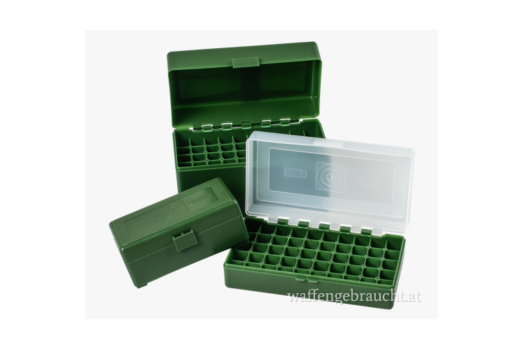 Munitionsboxen aus Kunststoff für 50 Patr. mit transparentem Deckel.