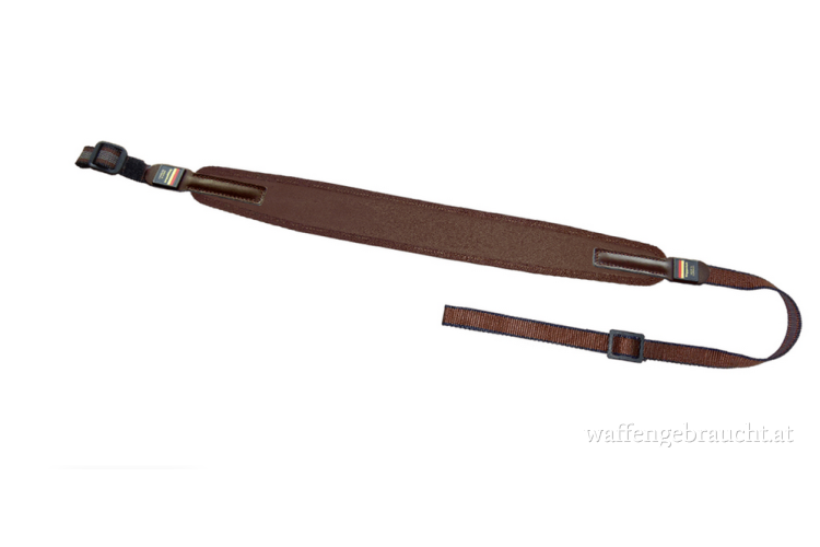Universal Gewehrgurt aus Leder mit Schnellverschluss. Hoher Tragekomfort durch ein breites, weiches Neoprenteil mit begrenzter Dehnung und optimaler Federung. Rutschsicherung und beste Haftung auf der Schulter durch eine genarbte, gummiartige Unterseite. Geräuschlos und pflegeleicht. Für alle Waffen mit Riemenbügeln (mind. 20 mm Durchlaß) geeignet.