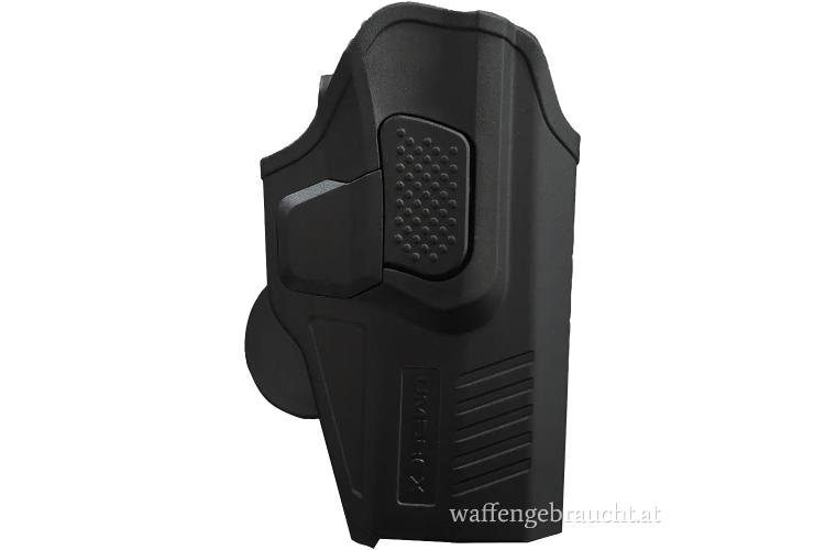 Holster passend für folgende Modelle: Glock 17 und 19, Smith & Wesson M&P9 und M&P45, Heckler & Koch USP und P8, Walther PPQ und P99.