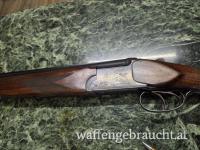 Lauflänge: 725 mm, Doppelabzug, automatische Kolbenhalssicherung, Auszieher, doppelte Laufhakenverriegelung, brüniert, einfachste jagdliche Randstich- und Arabeskengravur, Nussholzschaft, guter Zustand, Holz bei Abzug ausgebrochen, Läufe innen spiegelblank