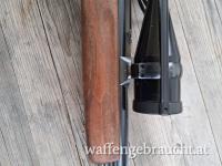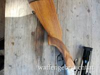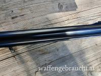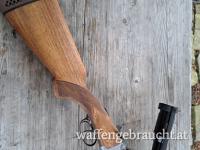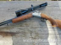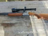 LL 65cm , glatte Laufschiene mit Klappkimme , Montiert mittels Schwenkmontage mit ZF Kahles Helia L 7x56 , Abs.7a , Französischer Stecher und Flintenabzug , Schiebesicherung am Kolbenhals , helle Basküle mit jagdlichen Szenen.