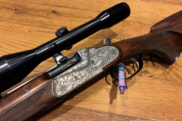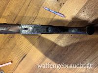 Gummikappe am Schaftende und graviertes Pistolengriffkäppchen. Der obere Lauf ist in klassischer Kugelschiene ausgeführt. Das Laufpaar ist extra schlank und nieder ausgeführt. Beide Läufe schießen einwandfrei zusammen.