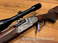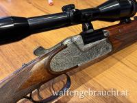 Sehr elegant gearbeiteter und leichter Bergstutzen von Hauptmann in Ferlach. Die Waffe hat eine Duralbasküle mit Stahlverstärkungen, lange Seitenblatten, Blitzschloss, schones Schaftholz mit bayrischer Backe und Schweinsrücken.
