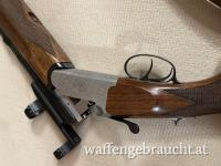 Unten am Gewehr angeführt der Kugellauf Kaliber 7x65/ und oben der Schrotlauf im Kaliber 12-76