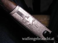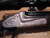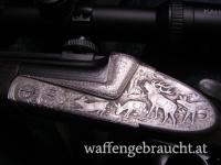 Ferl. Kipplauf Kal. 7x65 R, Luf von 8-kant auf rund übergehend aus Böhler Antinitstahl, EAW Schwenkmontage mit Glas Kahles Helia CBX 3-12x56 Leuchtpunkt lange Seitenplatten, re: Rehwild, li: Hochwild, Gehäuseboden 2 Gams, Gesamtlänge 104 cm, Lauflänge 63 cm, Hinterchaft vom vorderen Züngel bis Schaftende-Mitte 33,5 cm, Vorderschaft mit Tropfnase, schottische Fischhaut, sehr schönes Schaftholz mit kaum sichtbaren Gebrauchsspuren.
