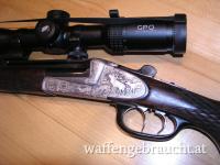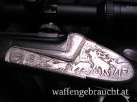 Ferl. Kipplauf Kal. 7x65 R, Lauf von 8-kant auf rund übergehend, Böhler Antinitstahl. EAW Schwenkmontage mit Glas Kahles Helia CBX 3-12x56 Leuchtpunkt (hat neue Leuchteinheit bekommen und wurde serviciert - Rechnung über € 362,- vorhanden). lange Seitenplatten, re. Rehwild, li. Hochwild, Gehäuseboden 2 Gams, Gesamtlänge 104 cm, Lauflänge 63 cm, Hinterschaft vom vorderen Züngel bis Schaftende-Mitte ca. 34 cm, Vorderschaft mit Tropfnase, Bayerische Doppelfalzbacke, Schottische Fischhaut, sehr schönes Schaftholz mit kaum sichtbaren Gebrauchsspuren.