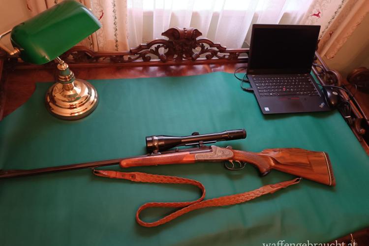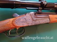 Kipplaufbüchse, eine sehr leichte und führliche Pirschbüchse; Seitenschlosse; Ejektor; tiefe Gravur Steinbock, Muffel, unten Gams; Schaft mit Schuppenfischhaut; vergoldete Abzüge, fein verstellbarer deutscher Stecher; Lauf innen blitzblank; Böhler Antinit Stahl!!
