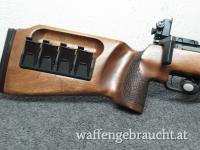 Geradezugverschluß, der Schaft ist aus Holz mit Griff, Fischhaut, Daumenauflage, Backe, Montageschienen für Riemen und Schaftkappe aus schwarzem Kunststoff