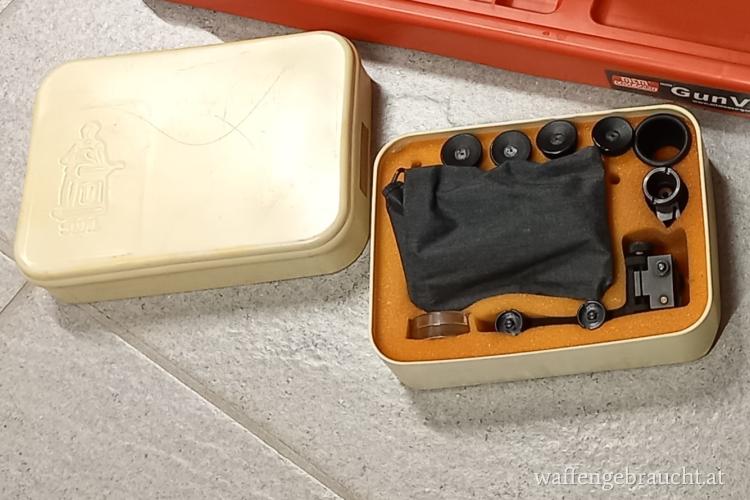 Diopter und Korntunnel in "Suhler" Originalbox inkl. mehrerer Balken- und Ringkorneinsätzen sowie Putzutensilien.