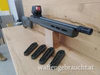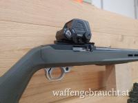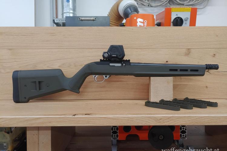 Verkauft wird hier eine Ruger 10/22 tactical mit 13"Lauf, 1/2x28 Mündungsgewinde, Mündungsbremse, Magpulschaft in OD green, 10 Schuss Magazin, Picatinnyschiene und Red Dot.