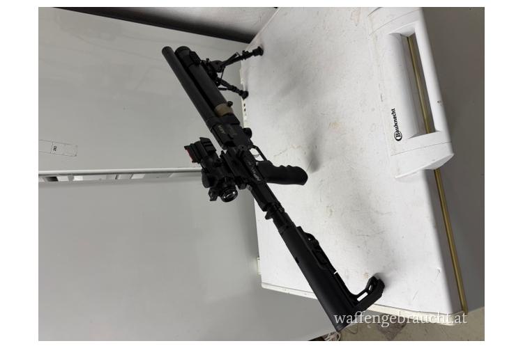Zubehör: Zielfernrohr Feyachi 4x32 mit farbigen 3fach Absehen in Grün-Rot-Blau Neuware / Zweibein Neuware / Picantiny Bottle Clamp Neuware 3fach am Tank / 1 x Manometer Abdeckung Neuware / Tank und Einfüllstutzen Abdeckung Neuware / 2 x Rundmagazin (1 x Alu und 1 x Kunststoff) sowie ein Einzelschussadapter / Professioneller Alu Waffenkoffer abschließbar mit Zahlenschloß. Bedienungsanleitung und Exportkarten von Go Gun 8,0 und 5,5 sowie die F Karte mit 0.9 dabei.