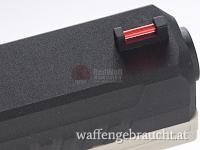 Diese Airsoft Pistole besteht überwiegend aus Metall und kommt in der Farbe Desert. Die strukturierten Griffschalen sind aus hochwertigem Kunststoff gefertigt. Das Modell hat vorn und hinten am Schlitten Riffelungen. Unter dem Lauf befindet sich eine Montageschiene zum Anbringen von Zubehör. Weitere Merkmale sind eine manuelle Sicherung sowie eine feste Visierung mit einem Leuchtkorn. Das Modell verfügt über ein verstellbares Hop-Up, welches für ein perfektes Trefferbild sorgt. Die Blowback Funktion sorgt für ein realistischeres Schießerlebnis. Der Antrieb erfolgt über eine Standard 12-g Co2-Kapsel. Das Magazin hat eine Kapazität von 22 Schuss BB Kugeln. Empfohlen werden Kugeln mit einem Gewicht von 0,20 g - 0,25 g.