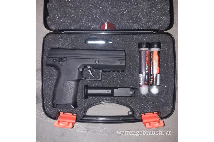 BYRNA SD Co2 Homedefense Pistole im Kaliber .68 und 16 Joule Leistung. Kann mit Adapter für 12g Co2 Kapseln auf 23 Joule erhöht werden. Muss man aber extra bestellen. Waffe ist fast neu und ungebraucht, im Koffer mit 2. Magazin, 5 Kynetic und 5 Pepperballs und Co2 Kartusche, Beschreibung und Originalrechnung.