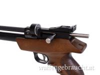 Die DIANA bandit mit integriertem Regulator ist eine leistungsstarke Pressluft-Pistole mit ergonomischen Buchenholz-Griffstück und aufgedrehtem Schalldämpfer. Die Pistole kann mit einer Einlage im Einzelschuss-Modus und mit einem 9-Schuss Trommelmagazin betrieben werden. Die gefräste Prismenschiene ermöglicht den Anbau einer passenden Optik. Der maximale Fülldruck beträgt 200 bar.