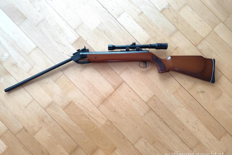 Klassisches Knicklauf-Luftgewehr mit Holz Schaft. Weiters ist ein Zielfernrohr montiert.