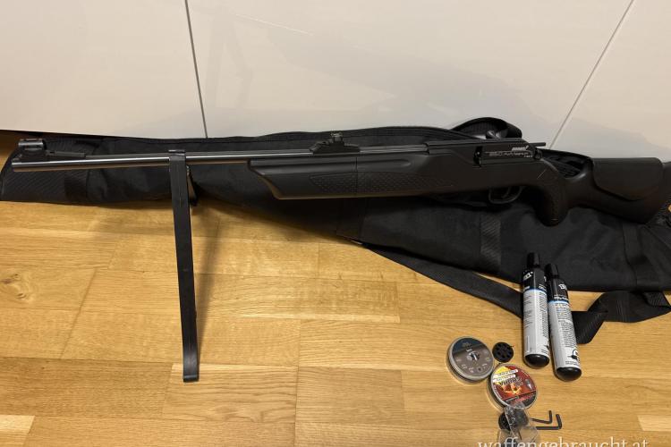 Das Luftgewehr kann wahlweise über eine 88 g-CO2 Kartusche oder mittels Adapter (nicht inklusive) über zwei 12 g-CO2 Patronen betrieben werden.
