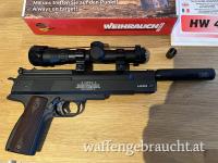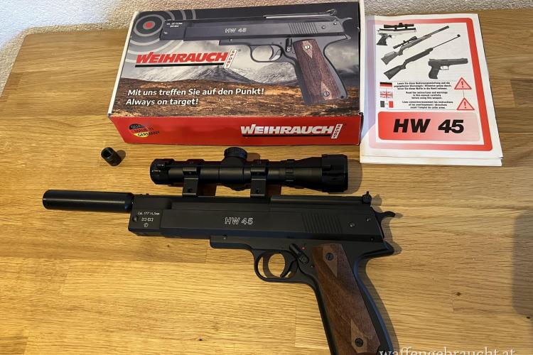 Verkaufe wie neue Weihrauch HW45 Luftpistole kal.4,5mm Diabolo mit Kurzwaffenzielfernrohr von Weihrauch 2x20 und abschraubbaren Schalldämpfer! Kaufdatum Mai 2024 Rechnung vorhanden!