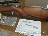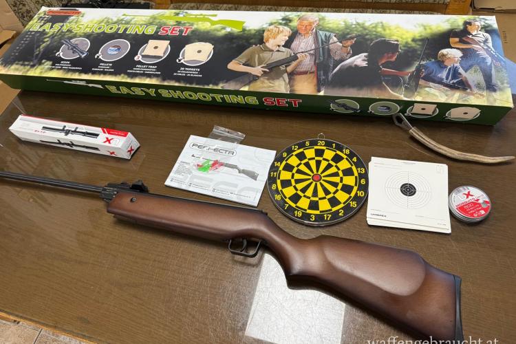 Das Perfecta hat eine Druckknopfsicherung, einen gezogenen Lauf, sowie ein Kipplaufpistole-Federdrucksystem. V0 = 175m/s.