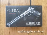 Verkaufe eine Softair Pistole G.10A (6 mm). Die Waffe ist im sehr guten Zustand und wird inklusive Schalldämpfer angeboten. Probeschuss ist vor Ort möglich.